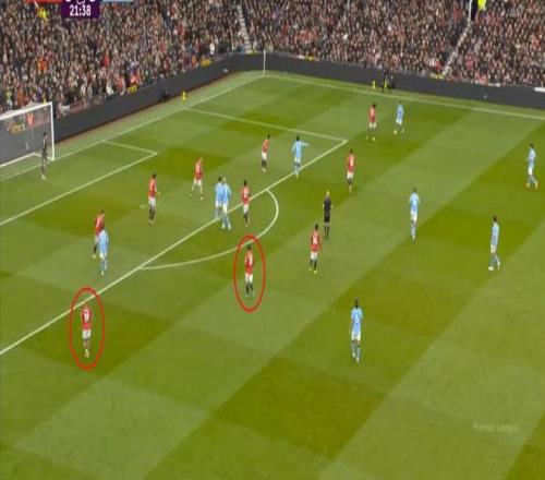 比如曼城曾在前场完成逼抢,让曼联需要在人员不整的情况下紧急防守: