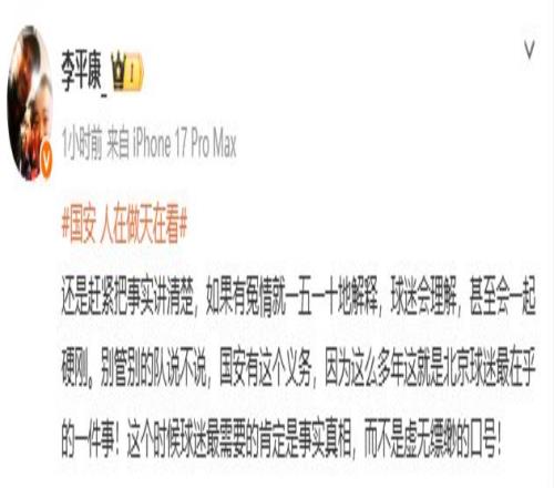 随后,李平康又表示,“还是赶紧把事实讲清楚,如果有冤情就一五一十地解释,球迷会理解,甚至会一起硬刚。别管别的队说不说,国安有这个义务,因为这么多年这就是北京球迷最在乎的一件事!这个时候球迷最需要的肯定是事实真相,而不是虚无缥缈的口号!