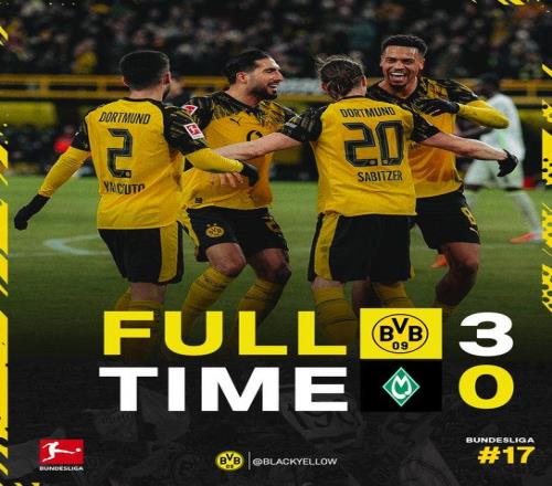 北京时间1月14日03:30,德甲联赛第17轮,多特蒙德坐镇主场迎战云达不莱梅。上半场施洛特贝克头球破门,多特蒙德暂1-0不来梅;下半场萨比策为多特再下一城,吉拉西锁定胜局,最终多特蒙德3-0不来梅,距榜首8分,继续位居第二位。