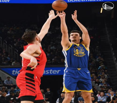 末节,科尔直接用波杰姆斯基、梅尔顿、理查德、桑托斯、霍福德的第三阵容了,开拓者是一个正常的轮换可他们这套正常轮换硬实力也非常孱弱,随后梅尔顿连拿11分接管比赛,他打成库里,比赛走向完结。